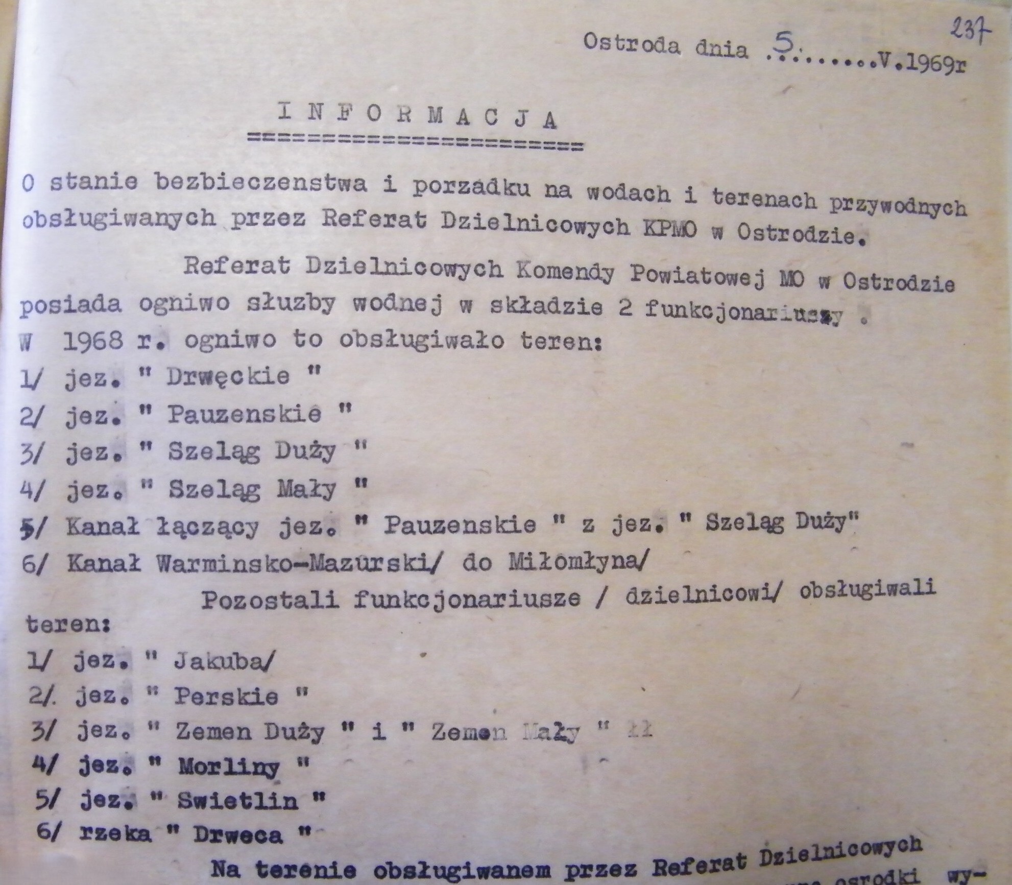 Była to informacja o stanie bezpieczeństwa i porządku w 1968 roku na wodach i terenach przywodnych obsługiwanych przez Referat Dzielnicowych Komendy Powiatowej Milicji w Ostródzie – zapewne sporządzona na potrzeby Miejskiej Rady Narodowej w Ostródzie.