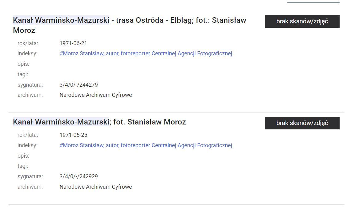 Kolejnym odnalezionym przykładem wystąpienia omawianego nazewnictwa są opisy zdjęć Stanisława Moroza (1925-2007), fotoreportera olsztyńskiego oddziału Centralnej Agencji Fotograficznej oraz „Głosu Olsztyńskiego” i „Naszej Wsi”.