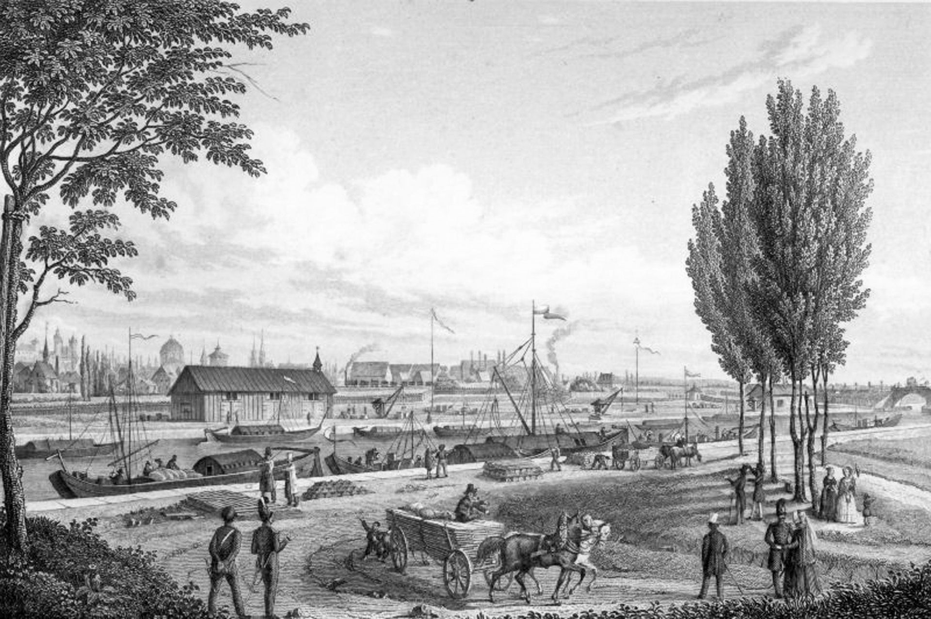 Ruch na austriackim Kanale Ludwika – rycina Alexandra Marxa z 1845 roku
