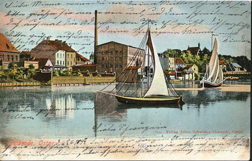 Widok miasta Ostródy od południowego wschodu - tym razem archiwalna reprodukcja fotograficzna wcześniejszego obrazu (z 2. połowy lat 40. XX w.) autorstwa Paula Schwittaya. Na Jeziorze Drwęckim widoczne statki