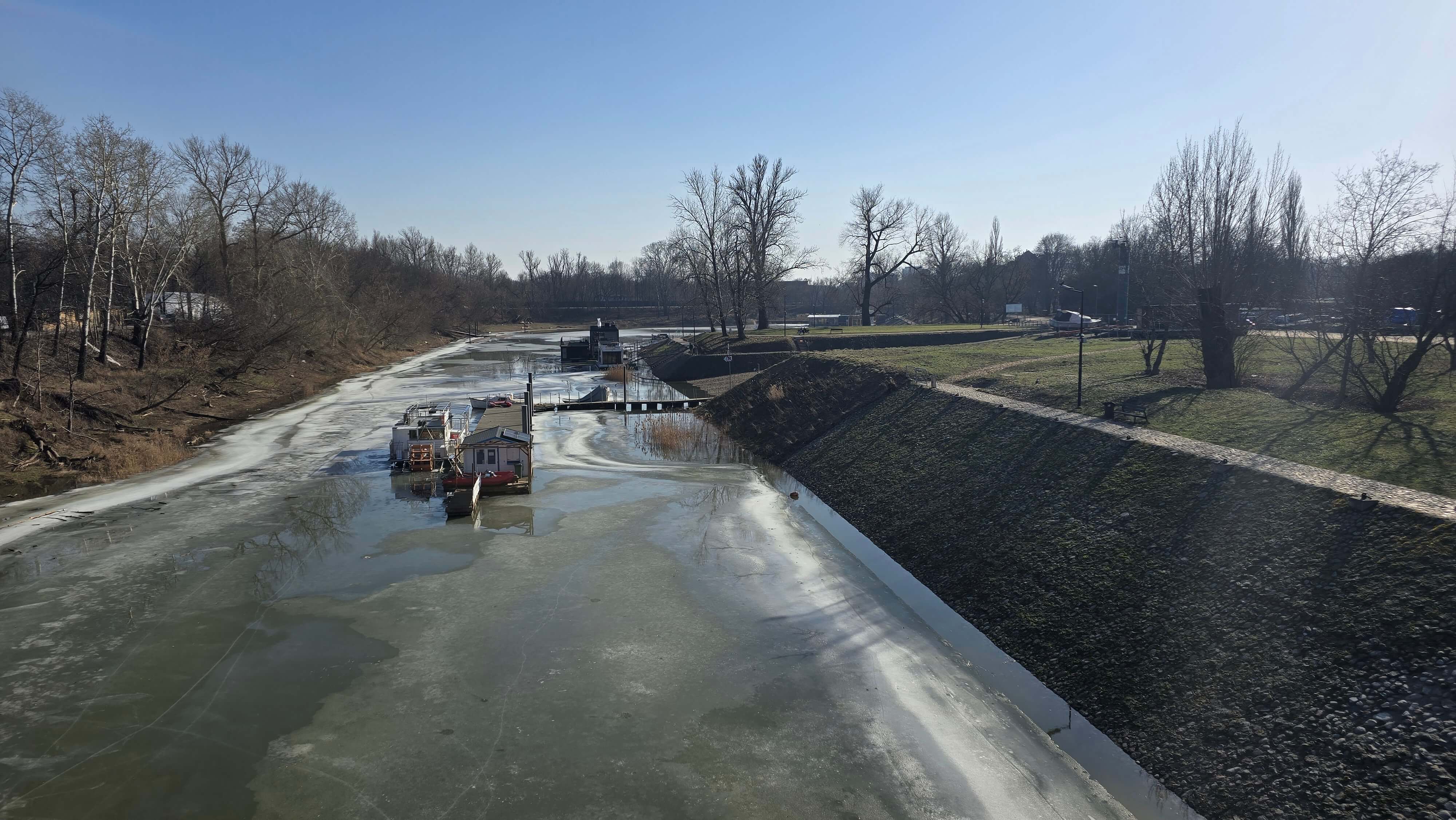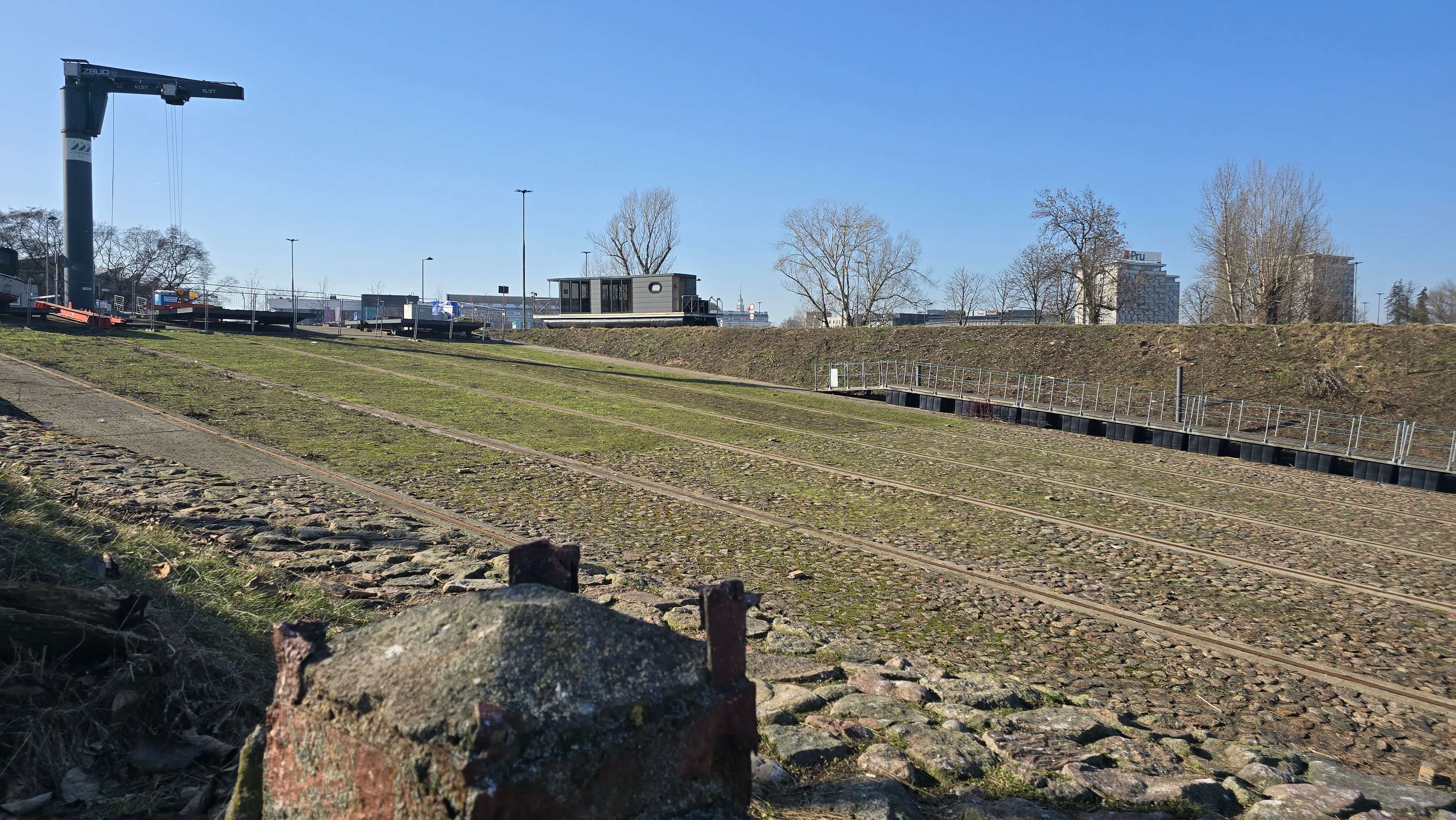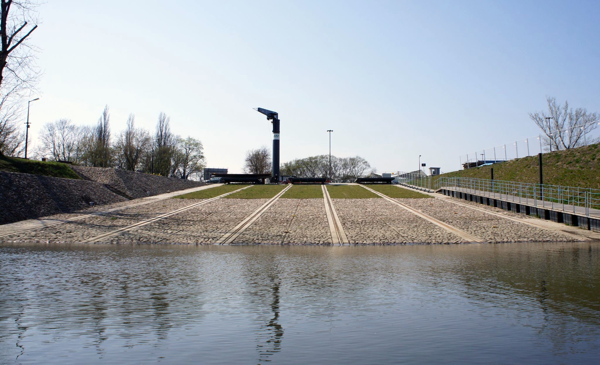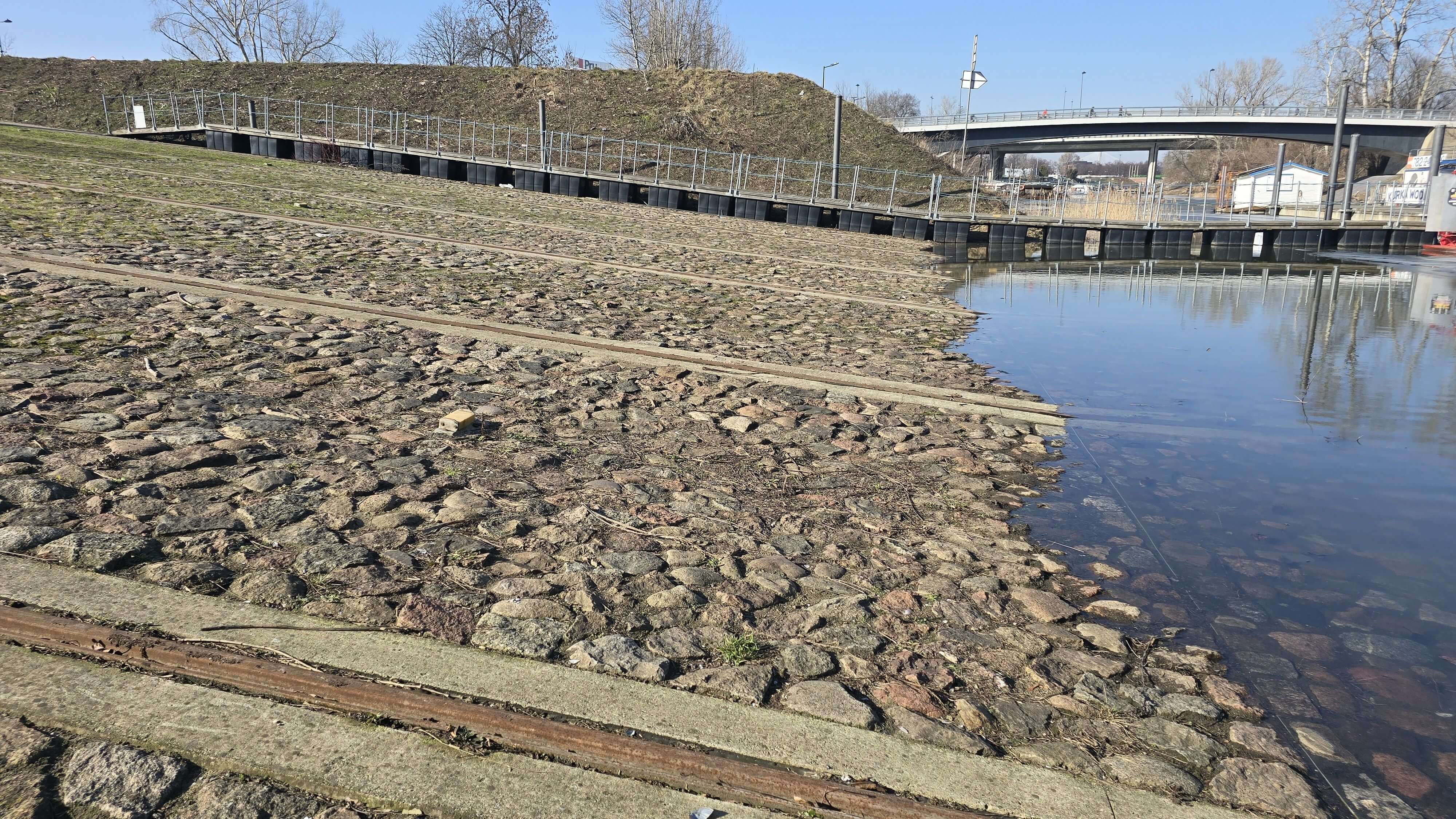 Widok współczesnej pochylni (luty 2026 roku) w Porcie Czerniakowskim